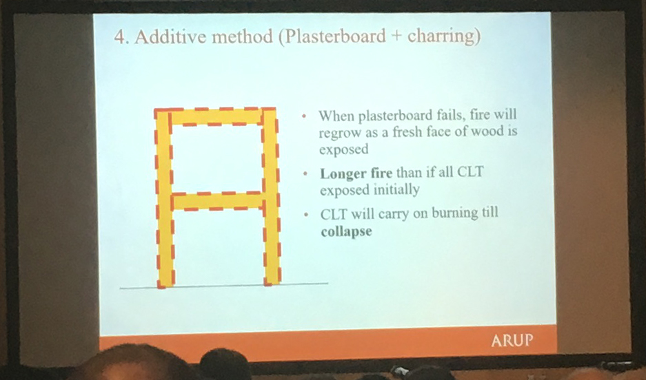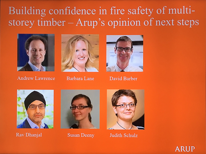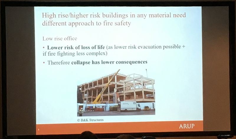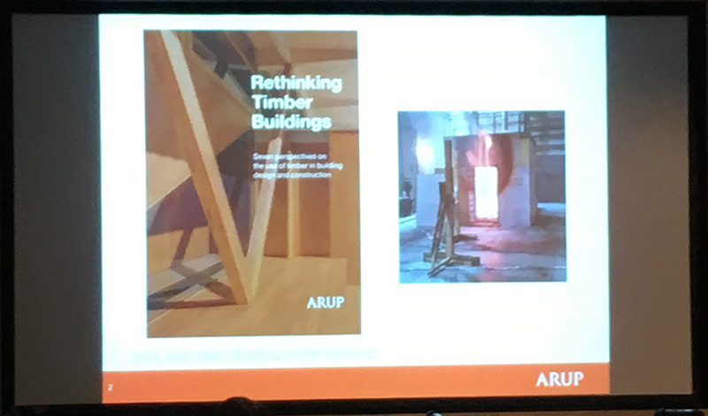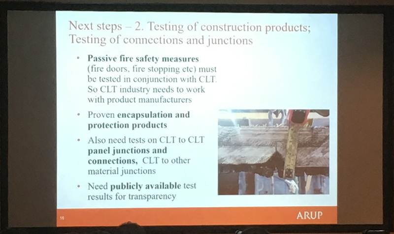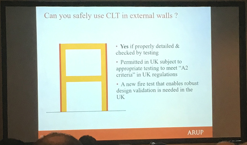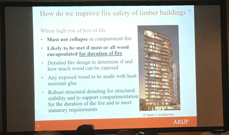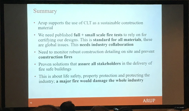 Andrew Lawrence from Arup discussed fire resistance concerns for buildings constructed using CLT. He emphasised in particular the need to carry out rigorous tests on this relatively new technology and that threats to safety become greater as buildings become taller. He addressed the need to update the current standards and building regulations that were written at a time when more traditional building methods were dominant.