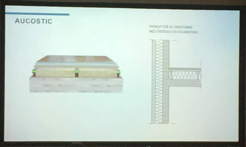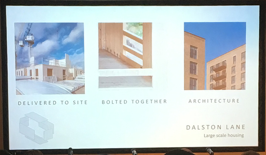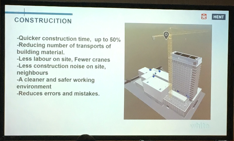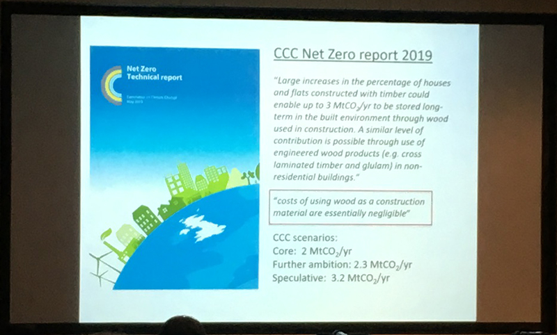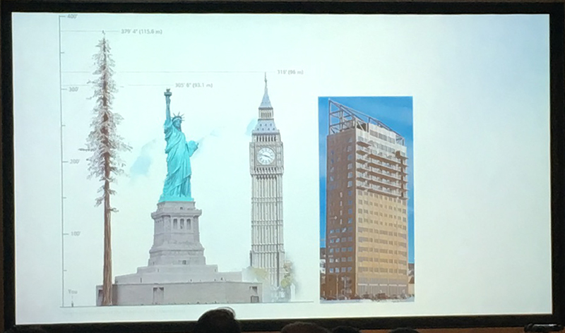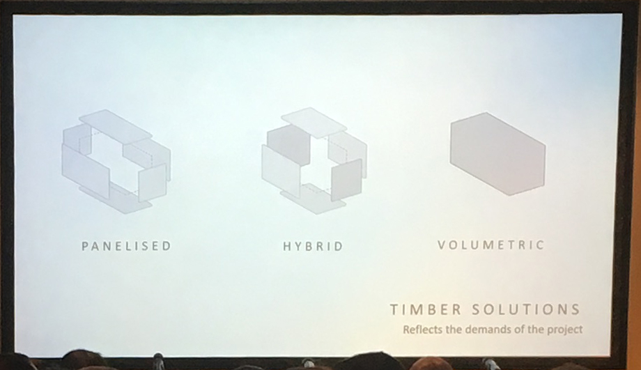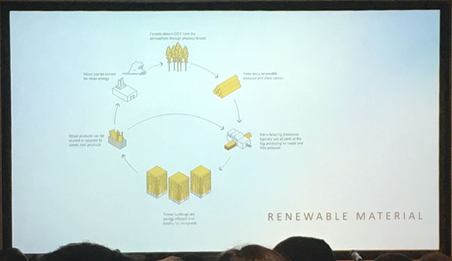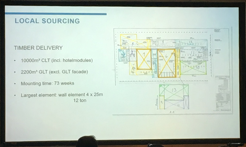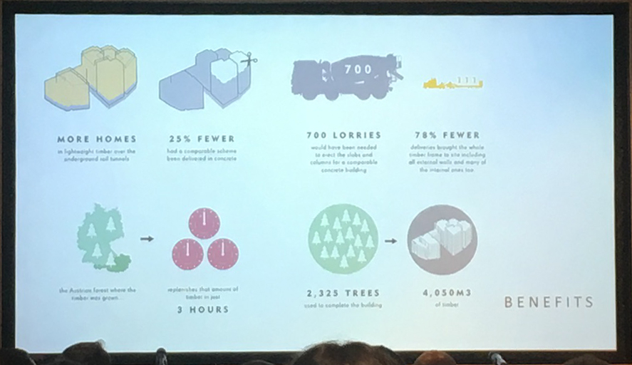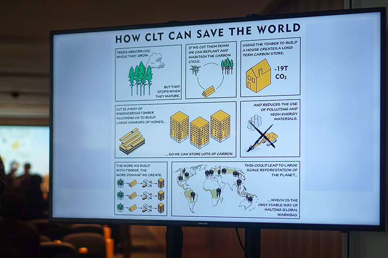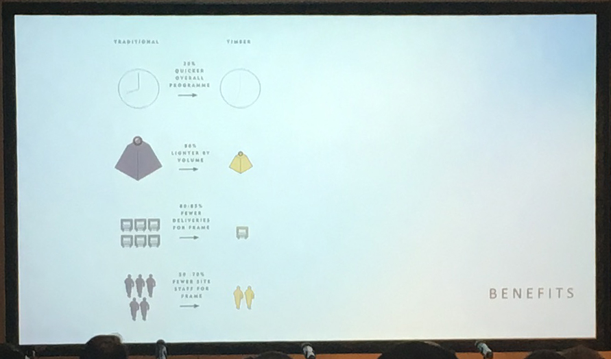 We were presented with some statistics to illustrate the benefits of CLT in comparison to traditional non-timber building methods.