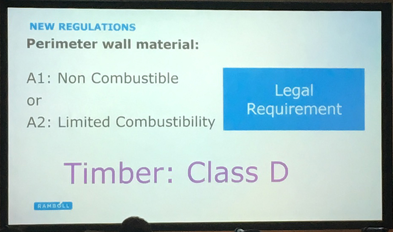 It is now legal requirement that perimeter wall cladding and other non timber wall build up mateials must be of Euroclass A1 or A2 in terms of fire resistance, and that timber is of Euroclass D.