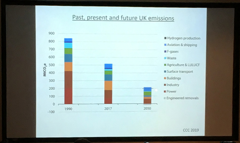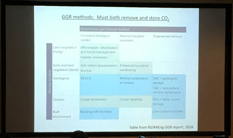 We looked at the Paris Agreement (COP21) and its targets for future global temperature and greenhouse gas (GHG) emissions, including to limit temperture increases to substaially less than 2 degrees C with a target of 1.5 degrees C, and the aim for the UK to produce 'net zero' emissions by 2050. We looked at the various ways of achieving this, not only by the generation of green energy and reducing activities that create emissions such as burning fossil fuels and building activities such as cement production, but also by removing carbon from the atmosphere, or Greenhouse Gas Removal (GGR). All of these contributors will be necessary to achieve the UK's net 0 by 2050 target.