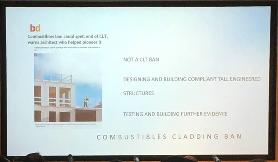 Some of the challenges include an anticpated government ban on combustibles including CLT in high rise buildings, along with other challenges such as insurance fears.