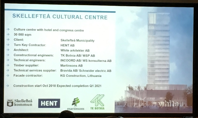 At 76 meters high the centre will be the tallest timber frame structure in Nordic countries. It has 19 floors over which a museum, art gallery, concert hall, library and a four-star hotel will be distributed. The height of the building will allow views of the countryside and forests around the city from the upper floors. Timber was the appropriate choice of material for the centre not just for reasons of sustainability, but also due the city's long tradition of timber production and construction.